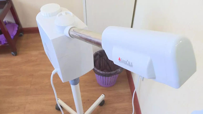 工作人員推出排du儀器,原來,這個排du儀器原理比較簡單,就是通過加熱水,冒出水蒸氣,用水蒸氣來噴到皮膚和毛發上。