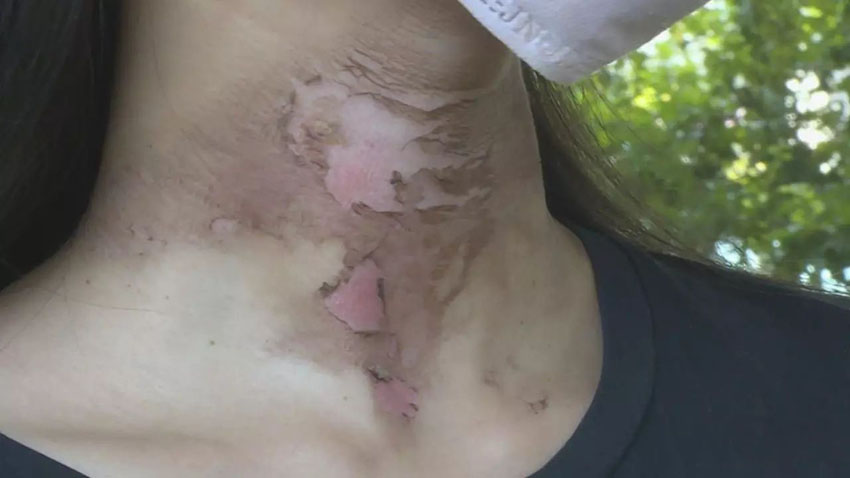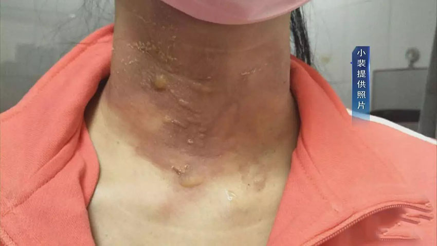 小裴:我剛躺下,他剛把臉上的妝給我卸了,然后我就覺得臉上挺疼的,然后我還以為是什么化學東西流到我臉上,當時挺恐慌的, 然后一看,脖子上有好多水,就是那種蒸汽水,而且是燒開了的蒸汽水,當時就是覺得特別疼,疼的我都哭了。
