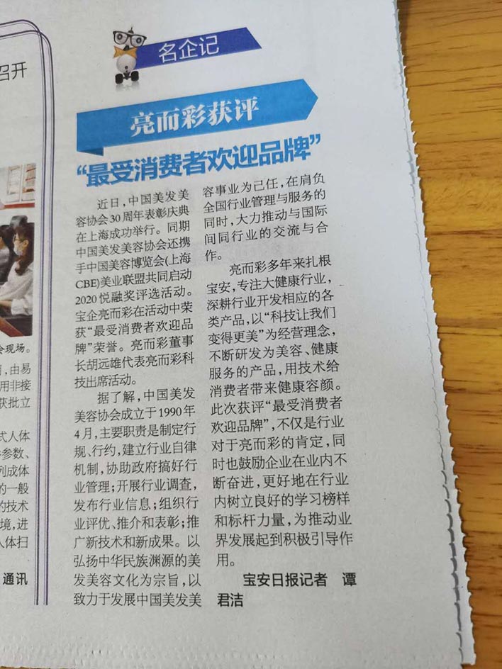 亮而彩多年來,一直專注于美容和大健康行業,贏得眾多消費者的青睞,此次,在深圳寶安日報曝光,鼓勵著我們堅持本心,以誠信為本,服務為綱,堅持走品質路線,品牌化經營,不斷研發高品質產品,為打造行業新風,便民生活,美麗服務而不斷努力,推動業界發展起到積極的作用。