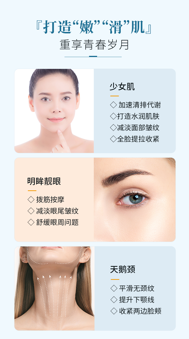 優(yōu)勢 非侵入式護理、舒服、快速、深效收緊皮膚、讓皮膚飽滿、通透、白潤、緊實。