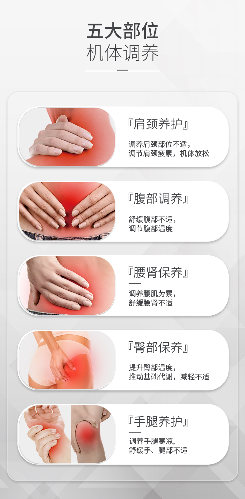 | 應用領域 | 肩頸+背+腰+腹+臀+手臂+腿(養生) | ||