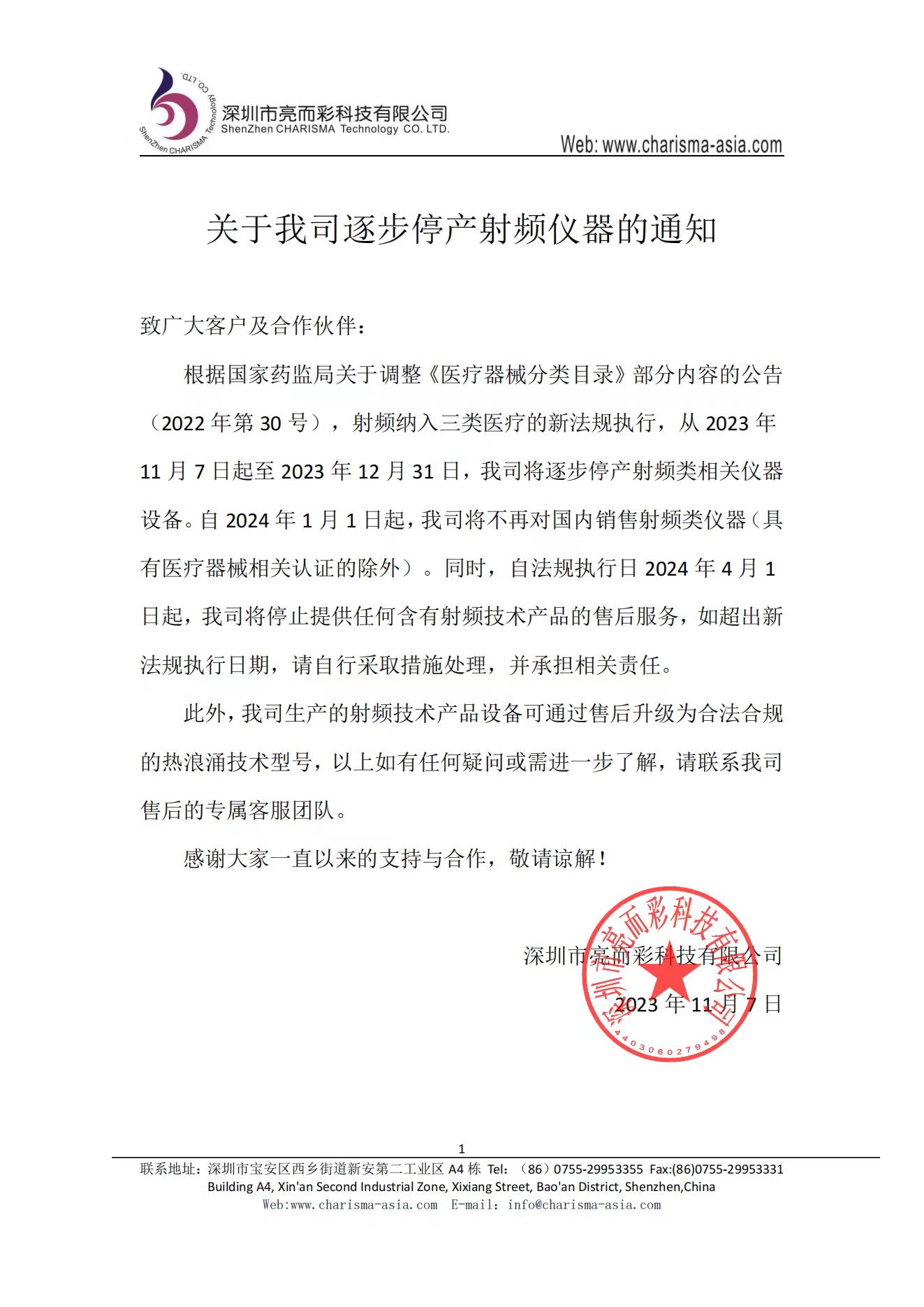 根據國家藥監局關于調整《醫療器械分類目錄》部分內容的公告(2022年第30號),射頻納入三類醫療的新法規執行,從2023年11月7日起至2023年12月31日,我司將逐步停產射頻類相關儀器設備。自2024年1月1日起,我司將不再對國內銷售射頻類儀器(具有醫療器械相關認證的除外)。同時,自法規執行日2024年4月1日起,我司將停止提供任何含有射頻技術產品的售后服務,如超出新法規執行日期,請自行采取措施處理,并承擔相關責任。