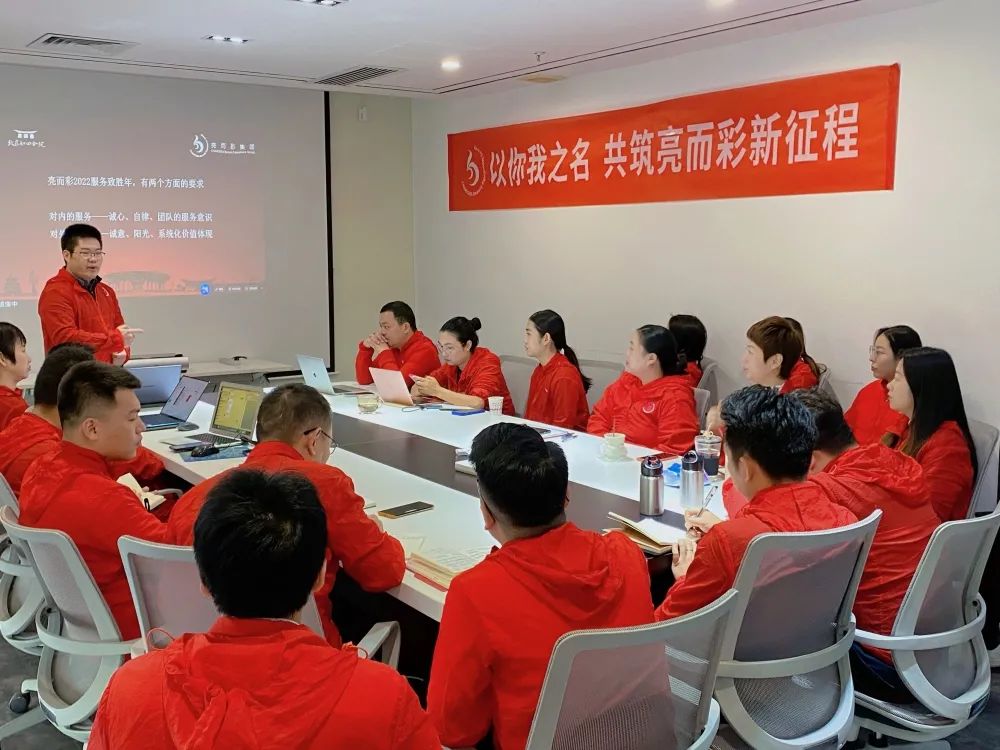 早上9點30分,員工準時到達,統一的文化衫,成了辦公室里一道靚麗的風景線。入座后亮而彩集團董事長胡遠雄先生及亮而彩集團總經理徐艷和女士進行致辭。先是對2021年的工作進行了總結與贊揚,接著提出了2022“服務致勝年”的新目標,為大家在接下來的工作中指出了明確目標。
