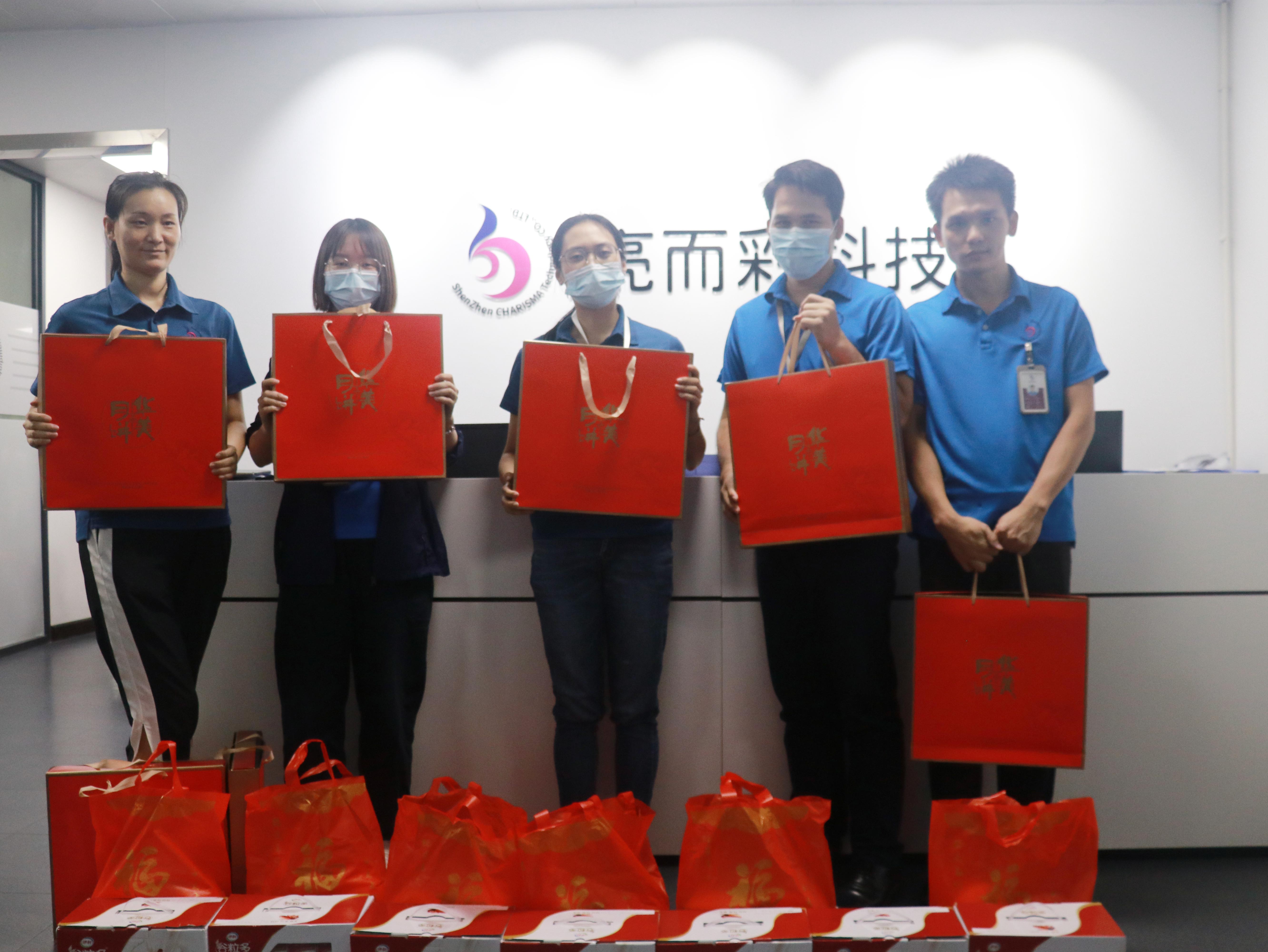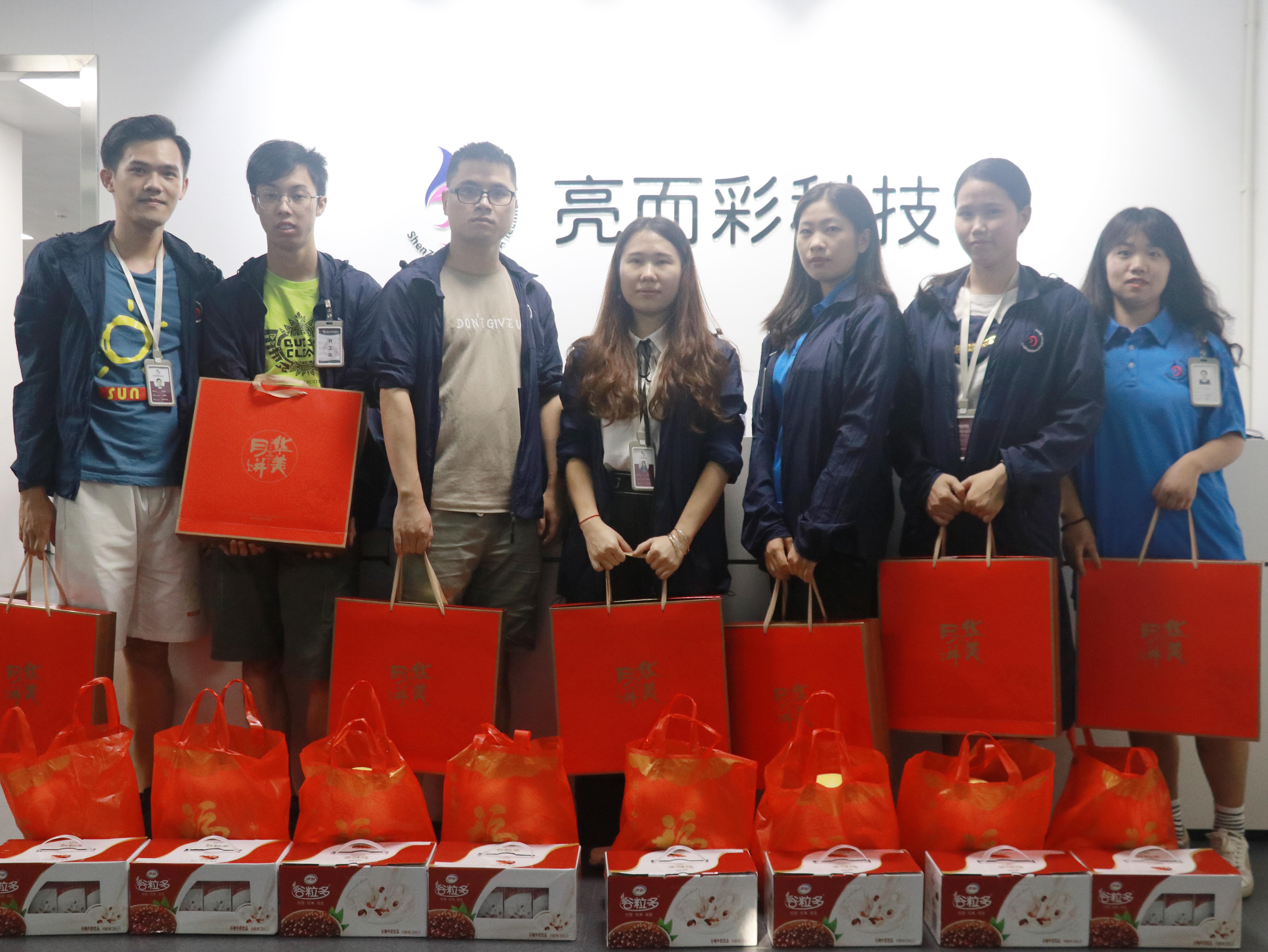 亮而彩員工關懷 寄托于故鄉之情,員工的關懷,亮而彩集團為全體員工小伙伴送上中秋禮上禮,濃濃的愛意倍感溫馨,精心為伙伴們準備了精致月餅禮盒裝、柚子、牛奶,體現了企業人性化的關懷,感受到公司如家一般的歸屬感,在即將迎來的月圓之夜,劃上了一段完滿的句號。
