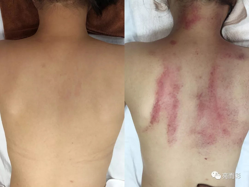|  左邊未做手法、儀器,右邊做了手法、妙纖大師 接下來是學習養身美容儀器養生專家的操作技巧,養生專家一般使用再肩頸和背上,下面我們看看做背的效果吧。 首先在背上涂了平衡霜,相對于外面美容師給涂的厚厚的油來說,這個霜簡要更清爽,接下來就是先用專一手法疏理清毒,接著用養生專家,操作頭在背上肩胛骨這一塊進行操作。 |