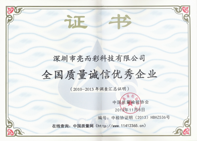 | 全國質量活動是我國長期開展的一項重大活動。2013“全國質量”活動以“大力提升質量 建設質量強國”為主題,由中國國家質檢總局、中共中央宣傳部、發改委、國資委、工商局等39個部門參與主辦,中國質量檢驗協會承辦,全國上千家知名品牌企業聯合舉辦,意在進一步發揮質量誠信標桿企業的引領和示范作用,號召更多企業強化社會責任意識,讓全體普通老百姓享有安全有保障的產品和服務。 2013年11月,“全國質量”活動圓滿落幕。作為專業高品質美容儀器生產商標桿企業,本企積極響應此次“全國質量”活動及政府部門關于“企業質量誠信倡議”的部署。  經過層層篩選;嚴格審核,我司亮而彩最終從眾多優秀企業中脫穎而出,獲得“全國質量誠信優秀企”的稱號; |