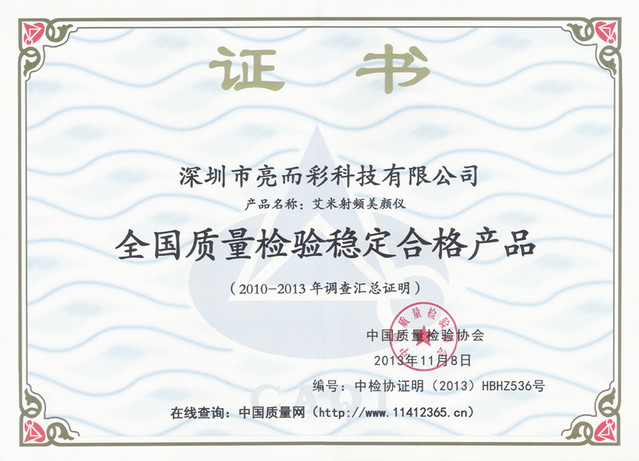 |  同時,我們亮而彩明星美容儀器“艾米射頻美顏儀”榮獲“全國質量檢驗穩定合格產品證書” 這無疑是對我們美容儀器設備品質的最大鼓勵,也是繼續讓我們推進的動力,我們一定會再接再厲,不驕不躁的。我們是亮而彩,因為您的到來而精彩! |